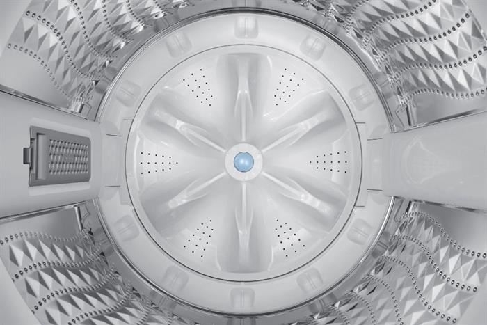 Máy giặt có thiết kế cửa trên quen thuộc với nắp kính chịu lực trong suốt, giúp quan sát bên trong khi máy vận hành. Kiểu dáng vuông vức, tông màu trang nhã nên dễ hòa vào nhiều không gian nội thất.