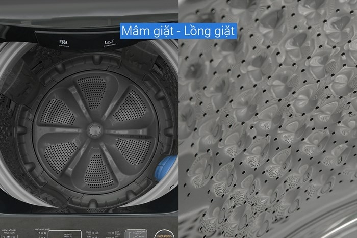 Lồng giặt thép không gỉ được dập nổi hoa văn dạng “ngôi sao pha lê” với các lỗ thoát nước nhỏ, tạo hiệu ứng cọ xát nhẹ như giặt tay, tăng khả năng làm sạch mà vẫn hạn chế xước vải, sờn vải và bám vi khuẩn.