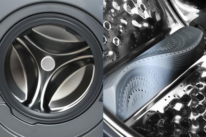 Lồng giặt bằng thép không gỉ cứng cáp, ít bám cặn và vi khuẩn, giúp tăng tuổi thọ máy đồng thời giảm ma sát trực tiếp lên bề mặt vải, hỗ trợ quần áo bền đẹp hơn sau nhiều lần giặt.